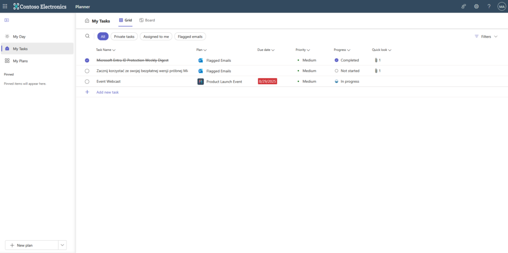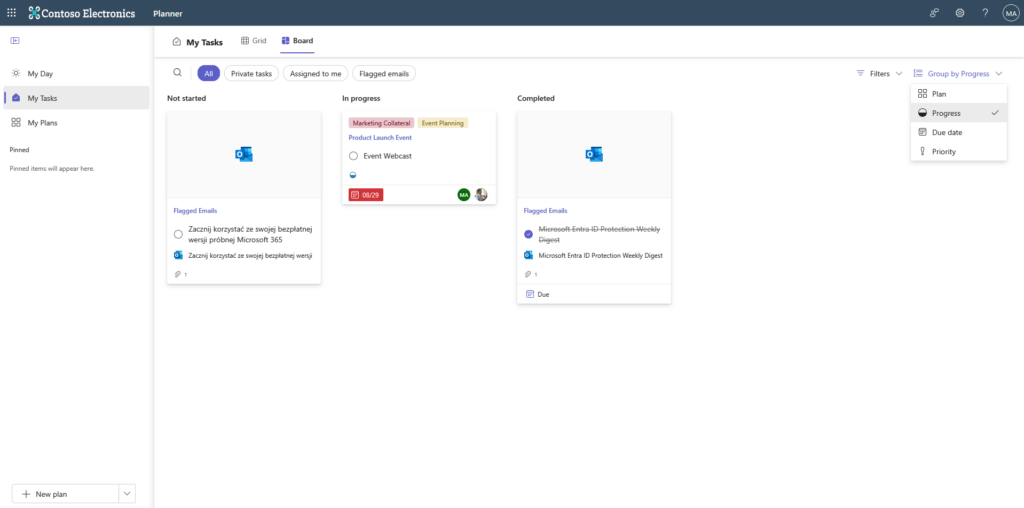The solution consists of a side navigation bar, from which you can switch between your day, tasks and plans you're a member of. There's also a "Pinned" section, which contains plans you want to keep handy. Pay particular attention to the "My Tasks" tab, which displays – as the name suggests – your tasks. This is a collection of tasks from various plans, flagged emails and those you've created for yourself within Microsoft To-Do. A quick glance is enough to see the task's origin, priority, progress, due date and whether it contains additional information as a file. You can also sort and filter tasks using these parameters. It might seem trivial, but you can narrow and expand the columns, which wasn't possible in the previous version of the app.