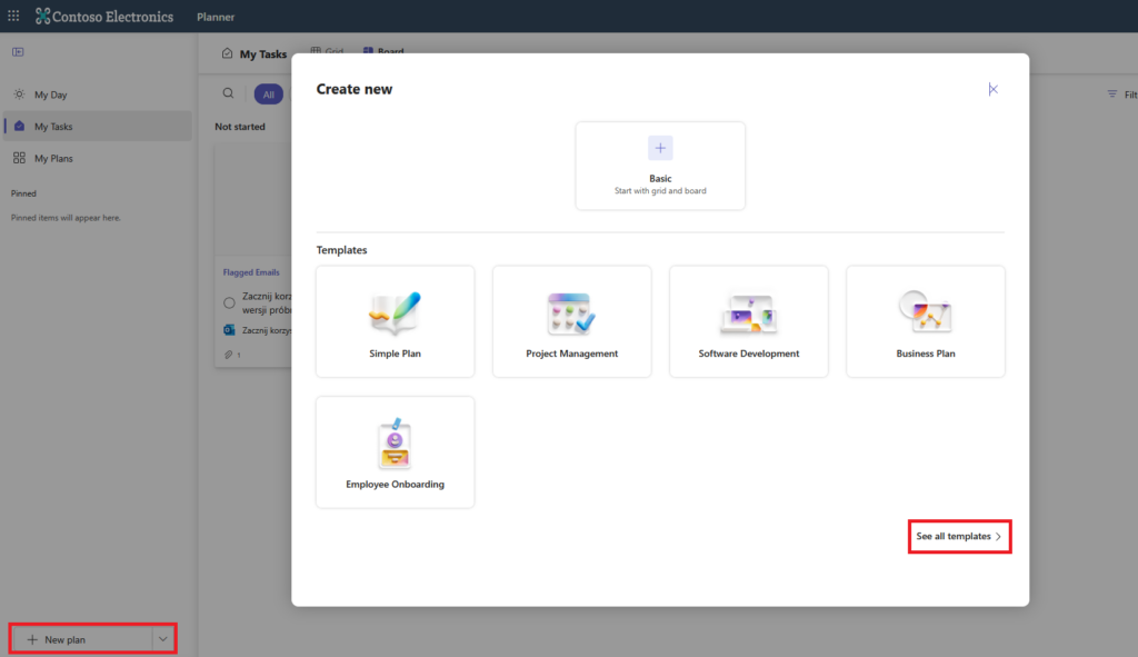 Another very useful feature is plan templates. Using them allows you to create a plan in a flash without having to think of the buckets and tasks within them. To use them, click "New plan" in the lower left corner of the app, then "See all templates" in the window that appears: