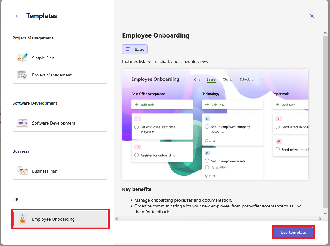 This will display the templates available for your Microsoft 365 license. For example, if you have a Planner Plan 3, you'll also find a template called "CRM Pipeline" or "Help Desk Tickets". For example, select a template available in the "HR" section and click "Use template." In the next step, you can change the name of the plan you're adding and decide whether to pin it so you will see it in the "Pinned" section.